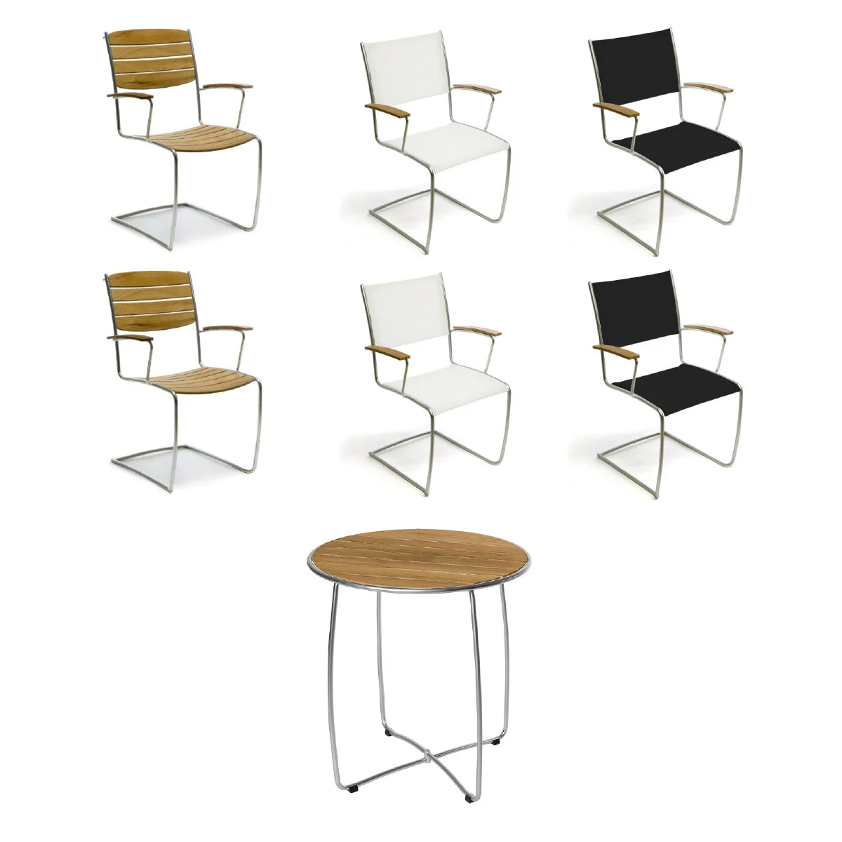 Välj mellan teak eller utomhustyg Textaline i svart eller vitt för stolarna