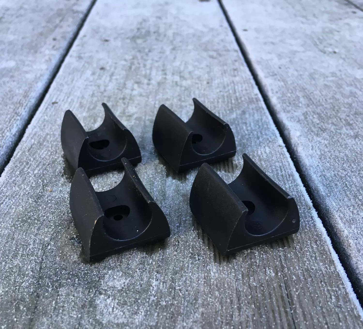 En komplett sats med 4 golvskydd i hård svart nylon för en stol